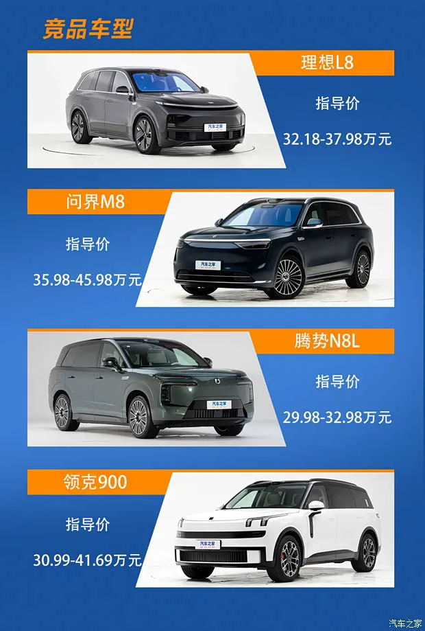 最后,智己LS8这足够给力的配置和价格,会遇到哪些对手呢?首先在中大型SUV里,同样作为8系,它首先就会遇到理想L8、问界M8、腾势N8L等车型的竞争,同时领克900的价格也会略有重叠,并且即将上市的极氪8X也会是同级别的一个强有力的竞争,不过智己LS8 25-30万的价格比对手都要低,采用错位竞争策略避与30万以上车型正面交锋,在同价位形成差异化优势。智己LS8采用全线控转向+24°四轮转向、800V超快充+超长续航,搭配均衡的综合产品力,成为同价位主打科技操控的一款均衡产品。●总结整体而言,智己LS8凭借其优秀的底盘操控,以及夸级别价格的优势,预售45分钟订单破万已验证市场认可度。如果后续能保持势头的话,在市场中应该有机会站稳脚跟。