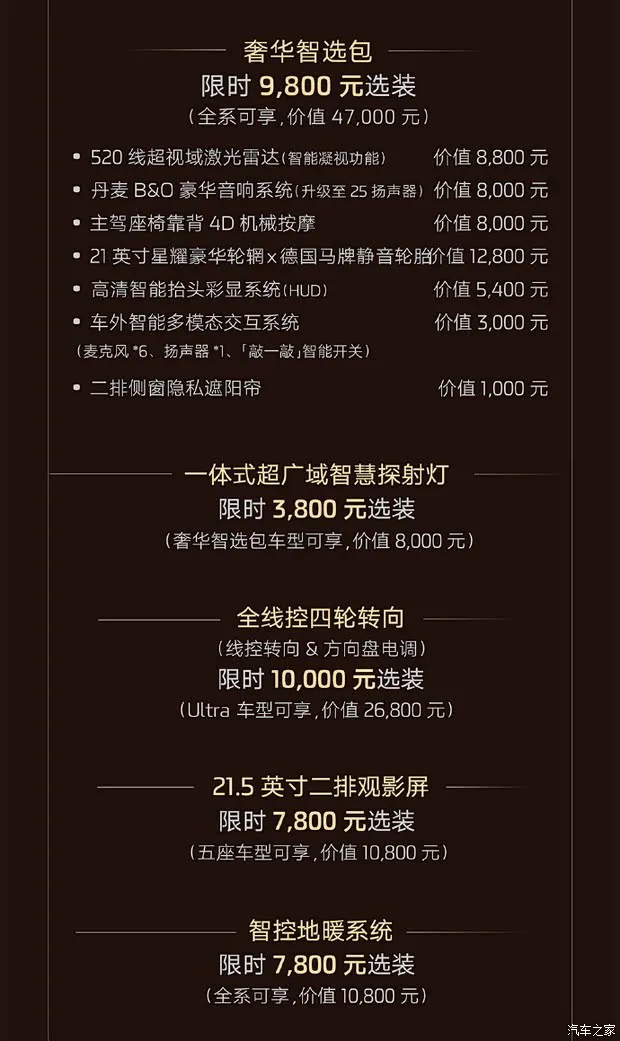 ●5款选装包 按需购买再聊聊选装,车辆目前提供5个收费选装项目,其中9800元的奢华智选包性价比最高,提供的东西包含520线的激光雷达,B&O音响从18升级到25扬声器,主驾驶靠背升级为4D按摩,圈升级到21英寸,HUD抬头显等等。这个选装包里面的东西基本都是实打实的配置,有条件建议上,别犹豫,后期改肯定不止这个价格。