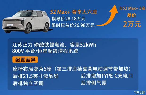 先看52MAX+ 大五座,上市权益价24.98万元,车辆采用1.5T增程器的恒星超级增程系统,800V平台,搭载一块52度的磷酸铁锂电池,供应商是江苏正力,CLTC续航355公里,综合续航1573km,30%-80%快充12分钟,采用230KW的后置单电机,最大扭矩430NM。车辆标配20英寸轮圈。车内采用27.1英寸主驾驶屏幕和15.6英寸副驾驶屏,采用高通8295P芯片,B&O 品牌18扬声器的音响,车辆座椅采用Nappa真皮,前后排带加热通风按摩,副驾驶采用零重力座椅。右后座是带腿托以及靠背可调的沙发椅,还有12.3L的双开门冷暖冰箱,车内还配有RNC主动降噪,四门电吸,并且都带双层隔音玻璃,入门配置确实非常顶,价格也非常有吸引力。