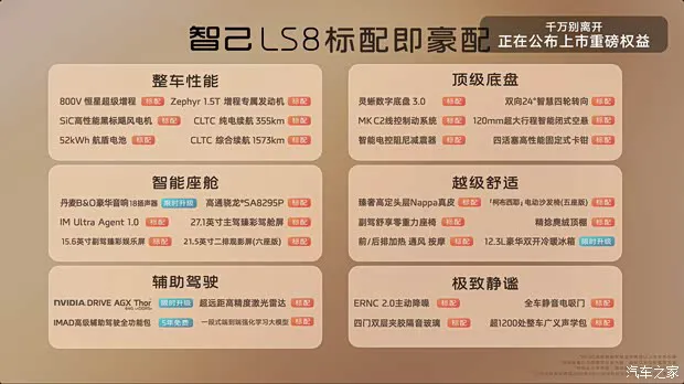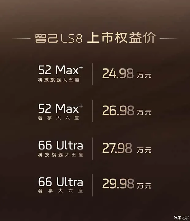 辅助驾驶方面,智己LS8在硬件方面搭载激光雷达,配合11颗高清摄像头、多颗毫米波雷达及超声波雷达,构建全方位感知体系,具备“智能凝视”功能,可精准识别前方道路行人、车辆、障碍物等重点区域,提升驾驶安全性。车辆还将搭载英伟达Thor芯片,拥有700TOPS算力,搭载由智己与Momenta联合研发的IM AD ZETA端到端大模型,可实现高速领航辅助NOA、城市领航辅助NOA及全场景智能自动泊车功能。●配置分析与车型推荐接下来配置分析,智己LS8共4个车型,其实如果仔细看车型,其配置很简单的分为两档,52 MAX+以及66 Ultra。然后各自分为5座版和6座版。