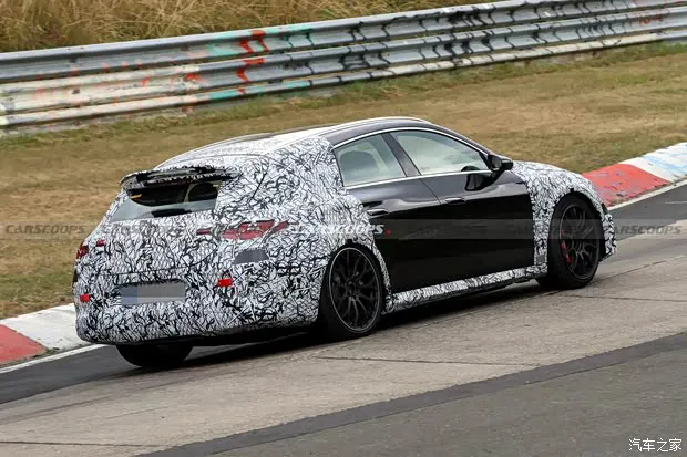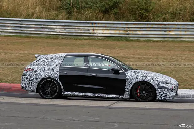 测试车整体延续现款CLA猎装版轮廓,作为AMG高性能版本,在细节处全面升级。前脸采用AMG家族化运动包围,搭配星徽式大灯组,两侧进气口造型更夸张,伪装下可见大尺寸导流结构,强化散热与空气动力学表现。车侧配备运动侧裙、轻量化运动轮圈,内部可见大尺寸高性能刹车系统,制动性能大幅提升。尾部最大亮点是集成于尾翼的可升降电动扰流板,高速行驶时自动升起优化下压力与稳定性,低速则收起降低风阻。