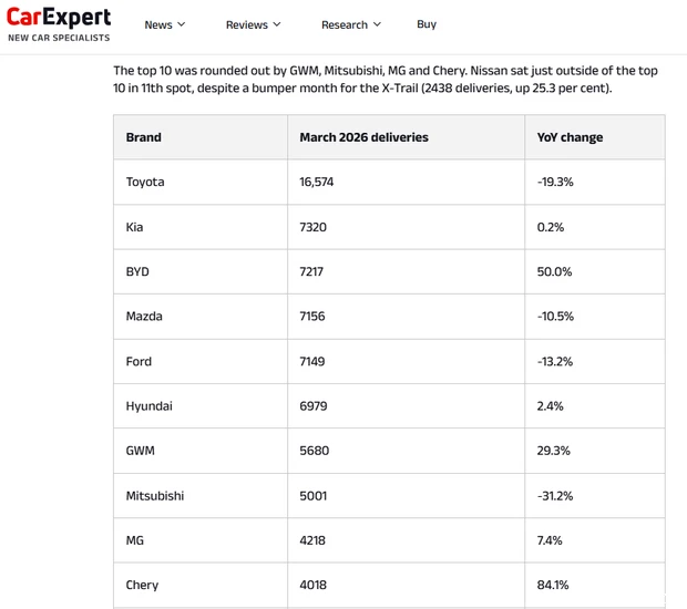 比亚迪已经是澳大利亚插电混动市场的头部选手 CarExpert数据显示,2025年,比亚迪在澳洲销售插电混动车型2.7万辆,市场份额达到50%。位居其后的是日本三菱汽车,市场份额仅10%。 2025年,比亚迪在澳大利亚销售汽车5.24万辆,同比增长156%。下图是CarExpert披露,今年3月份,销量**前10名,BYD已经挤进前3,长城、奇瑞、MG均上榜。