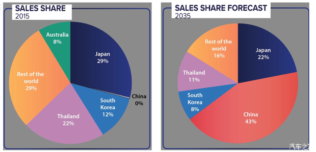 澳大利亚汽车工业协会(FCAI)数据显示,今年2月,中国首次成为澳大利亚汽车进口最大来源国,结束了日本自1998年以来的长期领先地位。中国车企在海外市场突飞猛进,占澳洲4分之1市场2月,澳大利亚销售了2.23万辆来自中国的汽车,市场份额约25%;位居其后的分别是日本和泰国,对应销量分别为2.16万辆、1.94万辆。预计2035年市场份额将进一步扩大到43%,而10年前,这个比例是0,澳洲车市是日韩的天下。