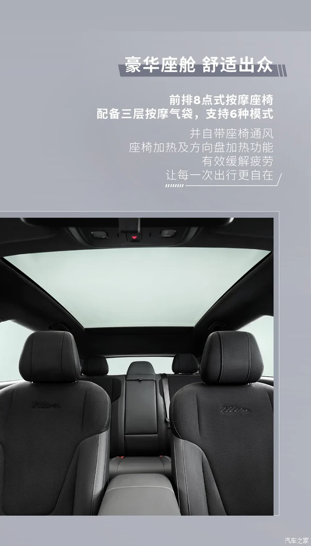 内饰方面,作为现款零跑Lafa5(参数|询价)的性能版本,其整体基本沿用了现款车型的设计风格,并在椅背等处进行调整,进一步提升车辆的运动气息。具体来看,该车整体采用黑化哑光枪灰镀铬饰件,搭配大面积软包材质,兼顾运动感与舒适度。同时,从图片来看其顶棚预计采用仿麂皮超纤绒材质,并在安全带压印Ultra字样。其他配置方面,该车将配备前排8点式按摩座椅(支持6种模式)、座椅通风、座椅加热、方向盘加热等