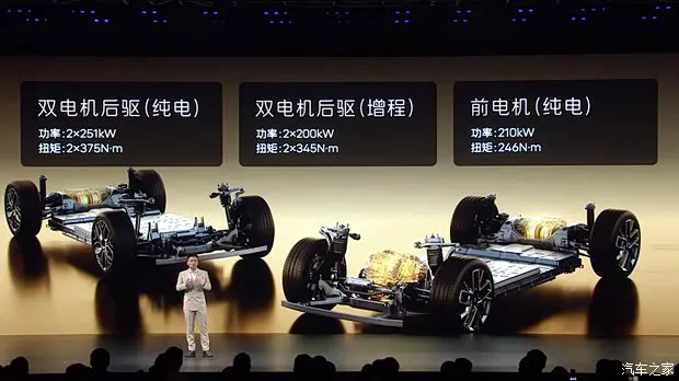 底盘方面,新车均采用前双叉臂独立悬架+后多连杆独立悬架,增程版Max与纯电版Max将会配备电磁减振器,其他车型将会配备智能空气悬架系统+CDC动态阻尼减振器,可实现魔毯悬架功能。新车还配备线控制动系统,并标配舒适刹停系统。动力方面,新车将会提供增程版和纯电版,增程版将配备后置双电机,纯电版将提供后置双电机以及前一后二三电机系统。根据资料,增程版车型综合功率400千瓦,最大扭矩690牛·米,0-100km/h加速时间为5.1秒,配备52.01kWh磷酸铁锂电池组,CLTC纯电续航里程为350公里,综合续航为1260公里。纯电版车型将使用全域800V碳化硅平台,后置双电机版本综合功率502千瓦,最大扭矩750牛·米,0-100km/h加速时间为4.1秒;前一后二三电机四驱版本综合功率712千瓦,最大扭矩996牛·米,0-100km/h加速时间为2.9秒。电池组方面,纯电版均配备麒麟6C超充三元锂电池,容量均为98.07kWh,CLTC续航里程为735公里(双电机)与670公里(三电机)。
