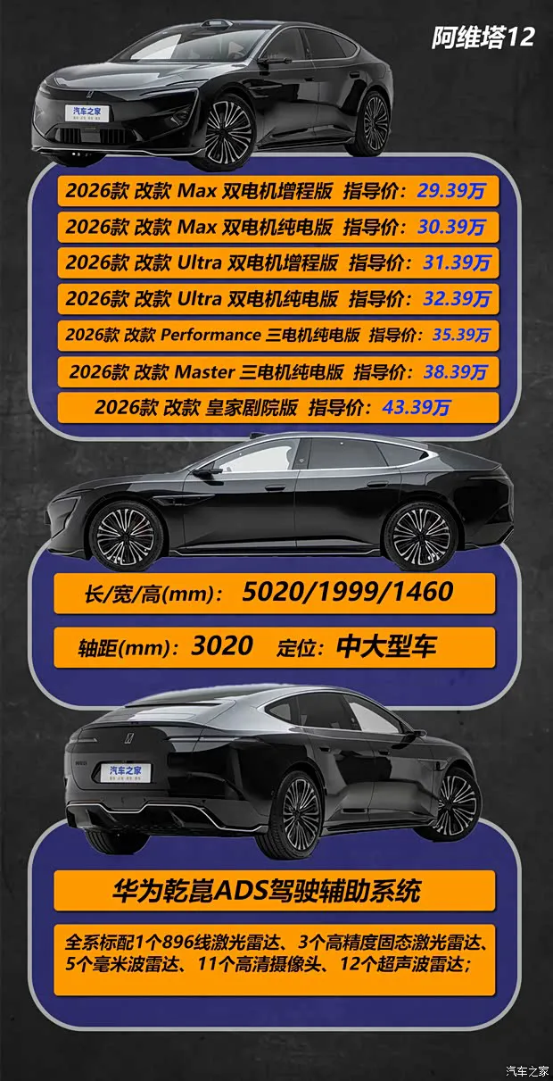 2026年4月8日,阿维塔旗下新款阿维塔12(参数|询价)正式上市,共推出7款车型,售价区间为29.39-43.39万元。新车整体外观、内饰设计没有太多变化,但在车型配置与动力方面进行了优化升级,例如全新标配四激光雷达,同时新增三电机动力系统。车辆的售价区间基本和老款处在同一区间,配置分为5个档次,并且依然提供增程和纯电动力,那这次的7个配置该如何选择?看我们一个个分析。