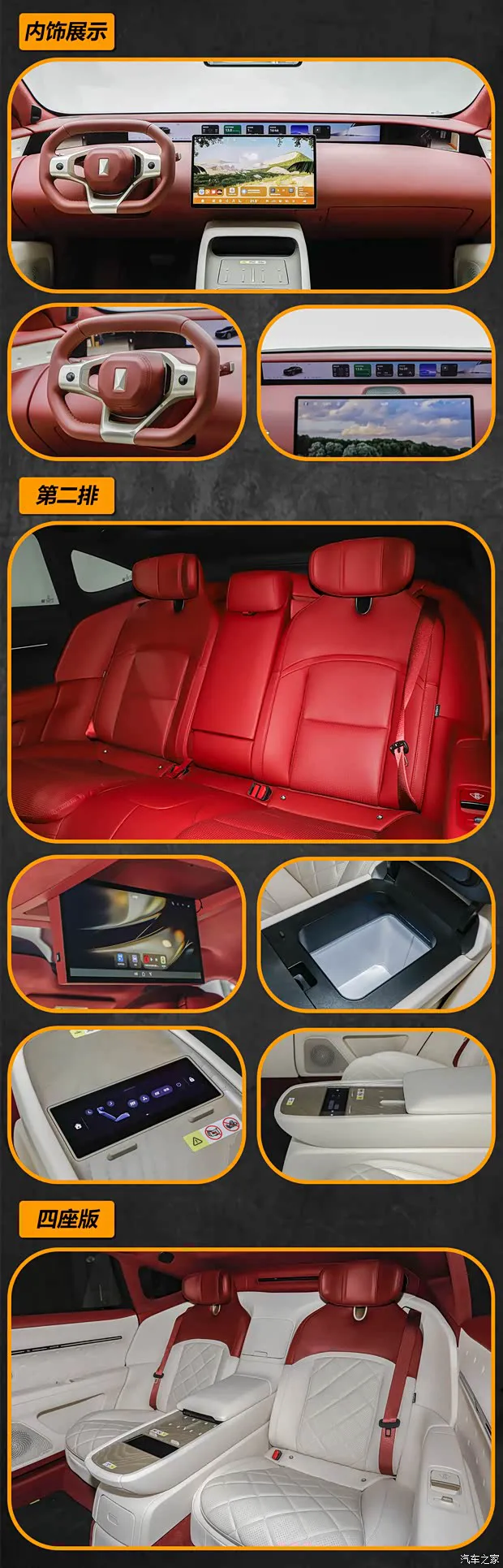 内饰部分,新车配备了35.4英寸4K一体远端屏,并搭配异形三辐式多功能方向盘,选配了电子外后视镜的车型还将配备双6.7英寸高清后视屏;新车中控台中间使用了悬浮式设计的15.6英寸智慧中控屏,整车标配鸿蒙座舱系统。此外,新车增加了前排中间气囊,顶棚材质更新为天鹅绒(顶配为超纤绒类麂皮)。配置方面,新车配备一体式运动座椅,主驾标配零重力座椅功能,副驾零重力座椅为选装配置,前排座椅标配加热/通风/按摩功能(顶配为石墨烯加热),后排座椅可按比例放倒;部分配置车型后排还可配备16英寸后舱悬浮天幕屏(豪华影院套装)。● 动力底盘
