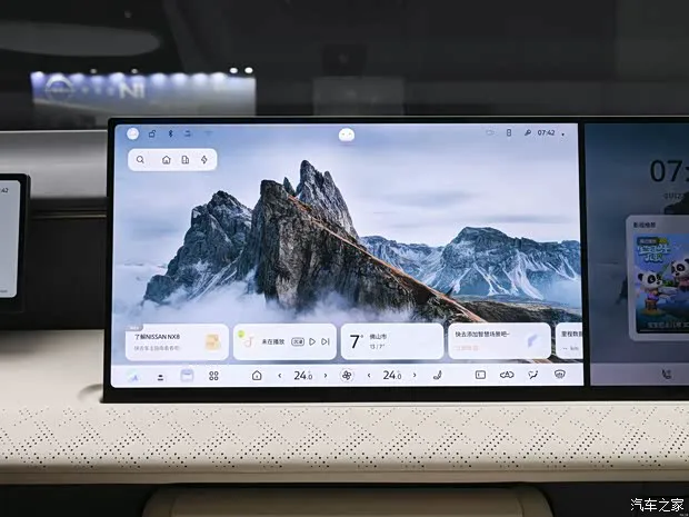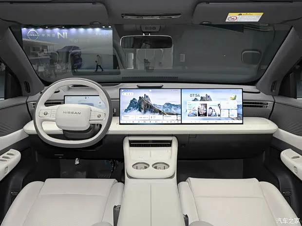●内饰温馨居家,智能体贴大五座内饰方面,日产NX8整体采用环抱式座舱设计,提供米白和雅黑两种配色。前排配备10.25英寸仪表盘+双15.6英寸连屏设计,还可选装63英寸AR HUD抬头显示。智能座舱采用NISSAN OS 2.0、高通8295P芯片、四音区智能语音,配置上还会提供256色光瀑式智能氛围灯和手机无线充电等。