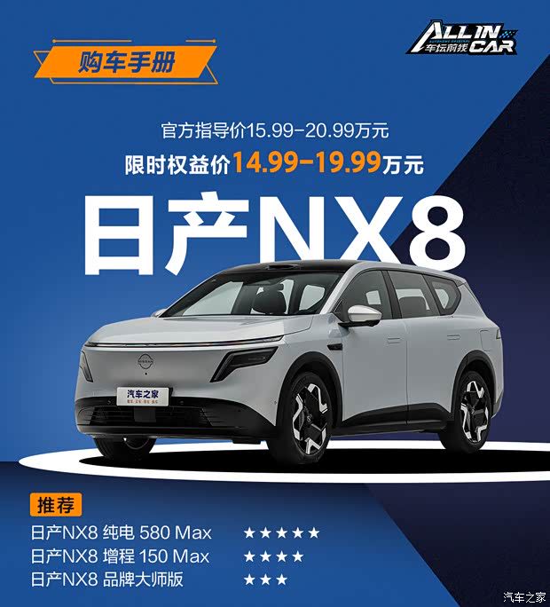 对于不考虑预算的朋友,日产NX8品牌大师版就是为你而来,限时权益价19.99万,就是在高配纯电 650 Max的基础上,把所有选装都给你安排了,还有e-Damper电控减振器系统带防晕车模式,以及发光格栅和感应电动门。