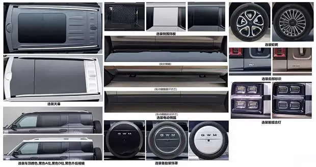外观方面,该车整体采用较为方正的车头设计,窄条幅式前格栅与两侧圆角矩形灯组相连接,搭配中央两条镀铬饰条,让其有着不错的粗犷感。值得一提的是,该车车顶配备激光雷达。车身侧面来看,新车采用了趋于平直的车顶线条,配合车身腰线以及隆起的轮眉,从而营造出较为硬朗的视觉效果。新车尾部采用了纵置尾灯组,为该车带来了不错的视觉效果。此外,其采用侧向开门结构,并配备挂式备胎。车身尺寸方面,车辆长宽高分别为5138(5299)/2050/1970mm,轴距为3000mm。