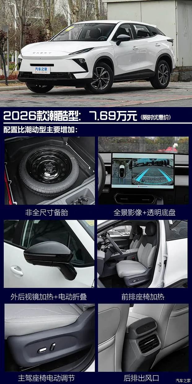 潮酷型相比潮动型,增加了备胎、前排侧气囊、全景影像+透明底盘、外后视镜加热和电动折叠、多媒体系统应用商店、前排座椅加热、主驾座椅电动调节、64色氛围灯以及后排出风口,实用性进一步提升。但前大灯为卤素灯泡,也没有L2级辅助驾驶,自动紧急制动功能欠缺,如果不是追求极致性价比的朋友,不推荐这款车型。