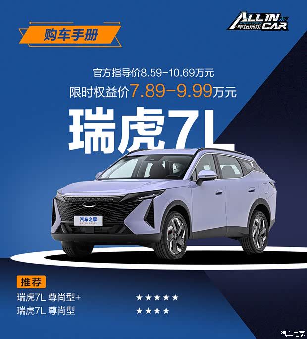 ● 配置分析与车型推荐接下来看配置部分。瑞虎7L有四个车型,分别是风尚型、智尚型、尊尚型和尊尚型+,官方指导价分别为8.59、9.19、9.99和10.69万元,限时优惠价分别为7.89,8.49,9.29和9.99万元。