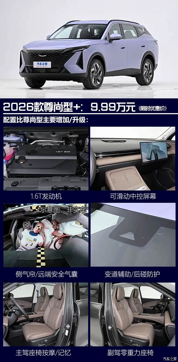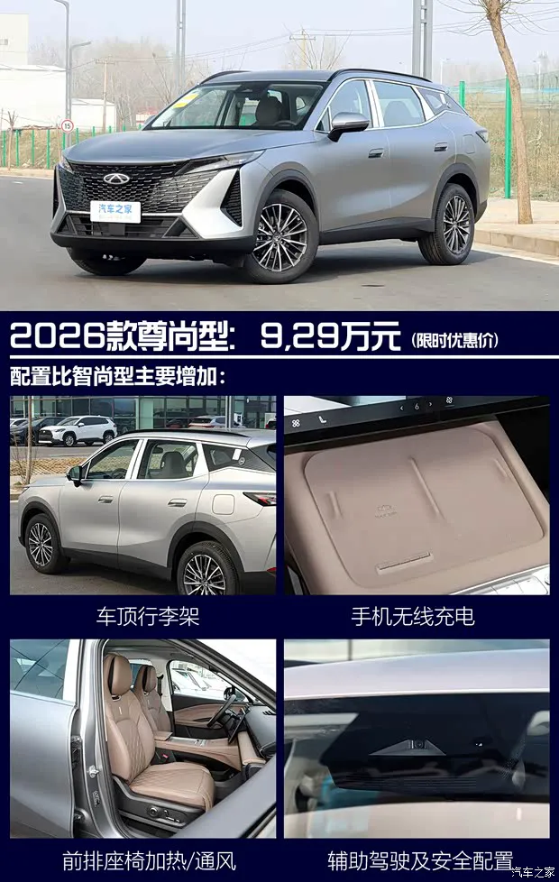 次顶配尊尚型,它比智尚型多了0.8万元,配置上进一步加入车顶行李架、车内氛围灯、手机无线充电、手机蓝牙钥匙、主驾座椅6向电动调节、前排座椅加热/通风、自适应巡航/自动紧急制动/车道偏离预警等功能,配置上比智尚型要丰富很多,大大提升实用性、舒适性和安全性,值得推荐,推荐指数四颗星。
