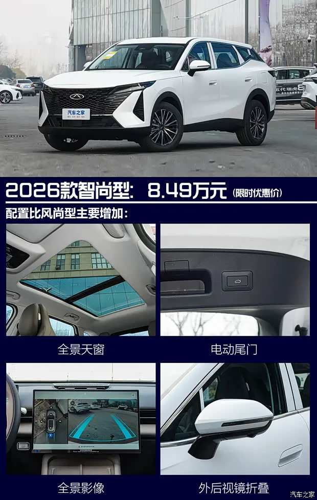 接下来看看次低配智尚型,它比风尚型多了0.6万元,配置上多了可开启式全景天窗、外后视镜自动折叠、全景影像、电动尾门(新车上市限时赠送),实用性一定增强,对得起差价,但配置整体来看还是不够丰富,也不推荐。