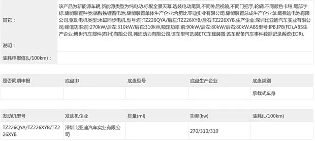 动力方面,此次新车申报了后置单电机与前一后二三电机两种版本。其中单电机车型最大功率370千瓦,三电机车型综合功率890千瓦。此外,新车预计都将配备第二代刀片电池和闪充技术。