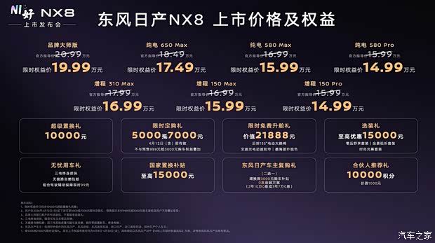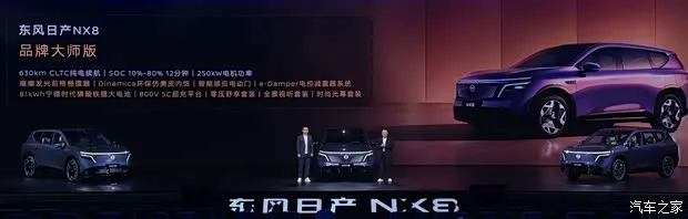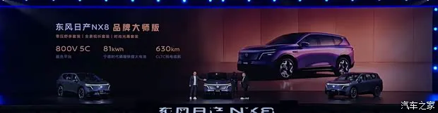 动力方面,东风日产NX8提供纯电、增程双动力选择,纯电车型搭载800V高压碳化硅平台与5C超充技术,其采用单电机布局,最大功率分别为215kW和250kW,并分别提供73kWh和81kWh两种电池组,对应续航里程分别为580/565km和650/630km。其峰值充电功率达463kW,充电6分钟续航提升300km,10%充至80%仅需12分钟。