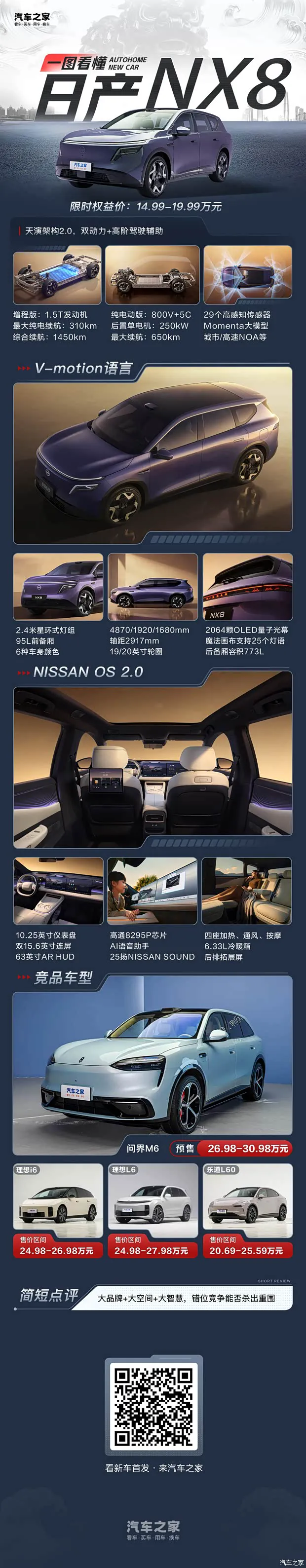 从产品定位来看,日产NX8是一款典型的家用取向SUV,再加上纯电与增程双动力布局,很容易让人将其与问界M6、理想i6、理想L6等热门家用车型归为一类。不过从车身尺寸不难发现,该车并未盲目追求越级体量,而是严格遵循中大型 SUV 的尺寸标准,同时通过轴距最大化设计提升空间利用率。