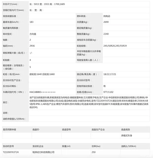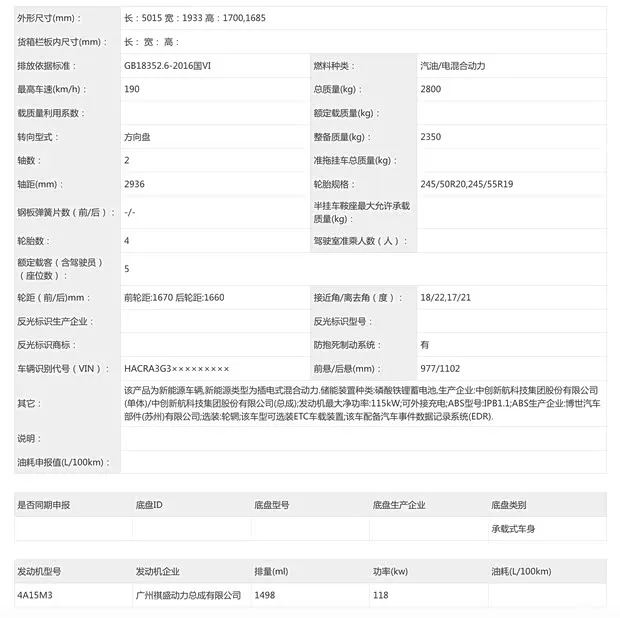 纯电车型参数动力方面,根据申报信息,增程车型搭载1.5T涡轮增压发动机,发动机最大功率118千瓦,采用磷酸铁锂电池,最高车速190km/h,纯电续航170km/180km。纯电车型采用单电机,最大功率250千瓦,提供磷酸铁锂电池和三元锂电池,最高车速183km/h, 纯电续航660km/800km。