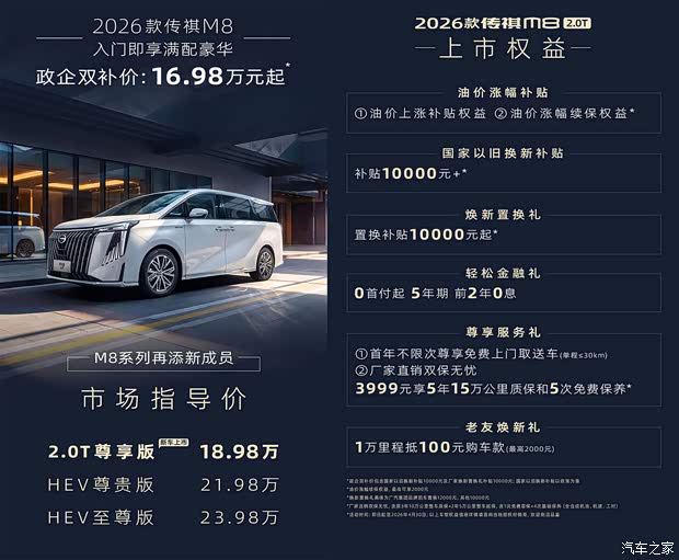 2026款广汽传祺M8 官方指导售价 车型 售价(万元) 2.0尊享版(新增车型) 18.98 HEV尊贵版 21.98 HEV至尊版 23.98 关于该车上市权益方面,包含10000元国家以旧换新补贴、10000元起置换补贴、0首付5年期前2年0息金融方案以及首年不限次免费上门取送车等。同时,官方还推出油价上涨补贴权益,至高可享2000元。