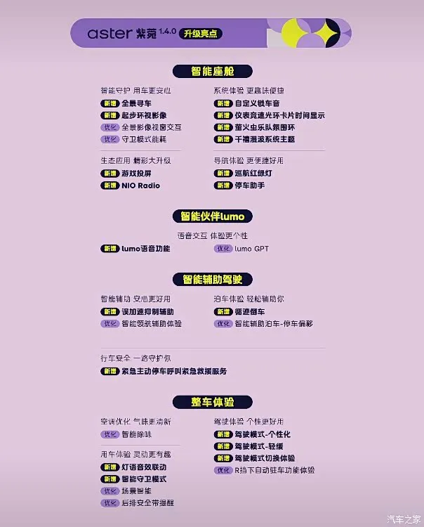 车内升级重点是车机系统更新为aster紫菀1.4.0版本,新增全景寻车、switch游戏投屏、自定义锁车音、萤火虫乐队氛围环、智能泊车辅助停车偏移以及寻迹倒车等功能。此外,新车还配备直接式胎压监测、副驾隐藏储物格和后视镜下翻+记忆等功能。