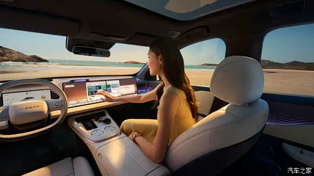 内饰方面,该车整体采用环抱式座舱设计,提供米白和雅黑两种配色。前排配备10.25英寸仪表盘+双15.6英寸连屏设计+63英寸AR HUD抬头显示,内置NISSAN OS 2.0、高通8295P芯片、四音区智能语音,配置上还会提供256色光瀑式智能氛围灯和手机无线充电等。