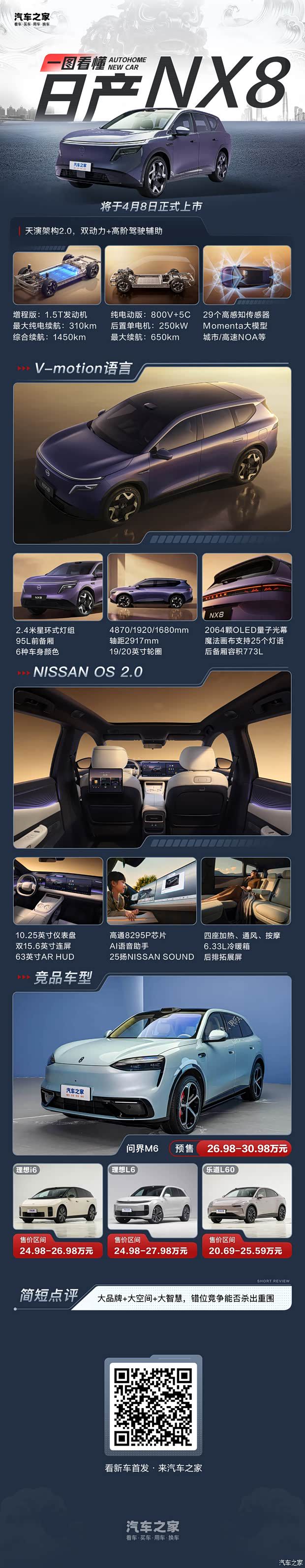 东风日产NX8车身尺寸对比 车型 长/宽/高(mm) 轴距(mm) 日产NX8 4870/1920/1680 2917 尚界H5 4780/1910/1657 2840 乐道L60 4828/1930/1616 2950 小鹏G7 4918/1925/1655 2890 如果以20万级的价格来看,日产NX8的竞争对手将会变成尚界H5、乐道L60以及小鹏G7等中型SUV,那么无论是从产品尺寸、智能化、舒适性还是动力表现来看,日产NX8的产品力都能够与之一战,甚至能够具备一定优势。或许,通过错位竞争的方式,也将成为日产NX8在国内新能源市场中立足的最大优势,当然,关键还是要看最终售价能够带来多少惊喜。编辑点评:东风日产通过近两年的努力,逐渐在国内的新能源市场积累了不少的关注度,并且市场表现也逐渐有所起色。如果说前两款车型(日产N6、N7)分别在新能源市场继承了轩逸和天籁的衣钵的话,那么这次NX8在新能源市场能否重现奇骏在过去取得的辉煌成绩,让我们拭目以待。