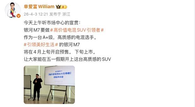 近日,吉利汽车传播策略部长,吉利银河公关部长单爱富在个人社交媒体平台上表示,“吉利银河M7(参数|询价)将于4月上旬开启预售,下旬上市,让大家能在五一假期开上(交付)”。此前,吉利银河M7已经完成实车首发,新车定位紧凑型SUV,搭载1.5升插混系统,29.8kWh电池版本的CLTC纯电续航达225公里,综合续航达1730公里。