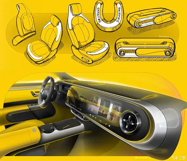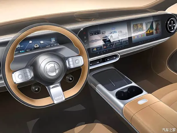 此外,官方还在车内的细节设计上加入了更多设计巧思。例如方向盘将新增左右对称的两个圆形功能按键,预计可以自定义功能或者安置驾驶模式调整等功能;此外,车门面板上将会内嵌千鸟格图案点缀,空调出风口则采用了圆形+十字扇叶的组合,营造出飞机涡轮的设计;同时,新车还将在中控台中间区域配备升降扬声器,整体的搭配均展现出了smart的精致新奢理念。