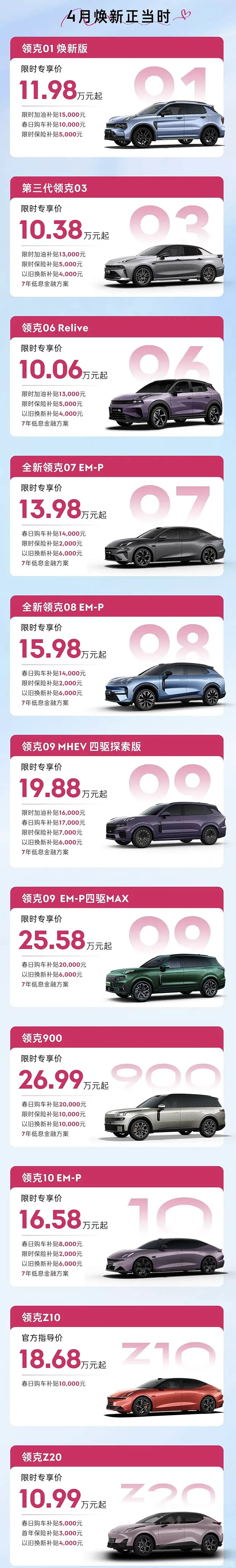 近日,我们从官方获悉,领克推出4月以旧换新活动,活动周期为2026年4月1日-4月30日(含当日下订),面向全国用户推出全系购车优惠,核心权益包括:全系车型全国至高直降46000元,叠加四项专项补贴;提供7年低息金融方案,日供低至27元起,降低购车资金门槛;四项通用补贴(部分车型可叠加):限时加油补贴至高16000元、春日购车补贴至高17000 元、限时保险补贴至高7000 元、以旧换新补贴至高6000元。