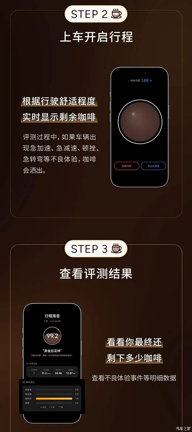 用户通过微信搜索进入小程序,将手机平稳放置于车内扶手箱或平台,软件即自动模拟加满100%的赛博电子咖啡。行程中,软件实时监测车辆纵向加减速、横向转向、垂向颠簸等动态数据。一旦出现急加速、急刹车、顿挫、急转弯等影响舒适感的操作,屏幕中的电子咖啡便会相应“洒出”。