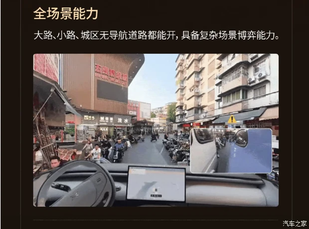 城市无导航NGP漫游:无需预设导航路线,车辆可在城区大路、小路自主通行,结合交通信号与路况自主决策,覆盖更多日常通勤场景。