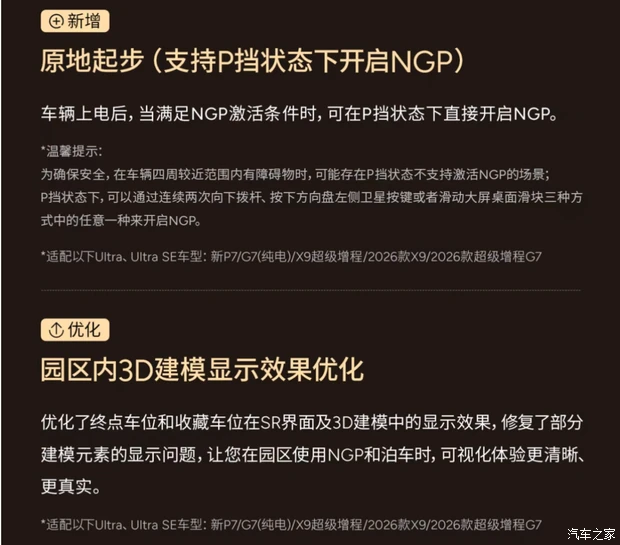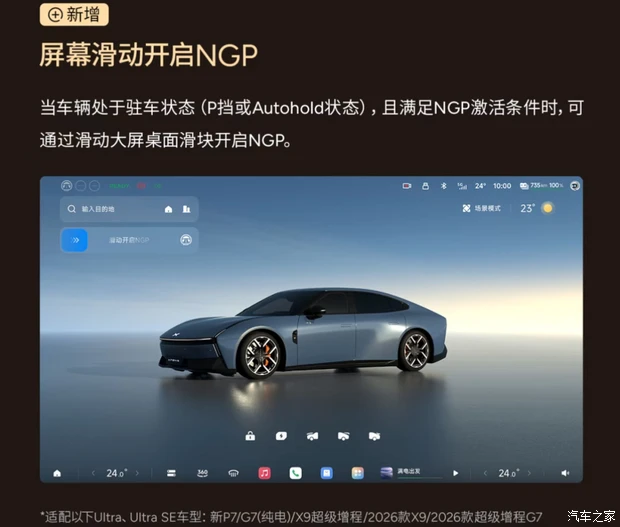 本次天玑AIOS 6.1.0推送覆盖多款主力车型,包括2026款小鹏P7+、G9、G6的Ultra及Ultra SE版本,G7超级增程版等均在升级范围内,全国小鹏门店同步支持相关升级服务。