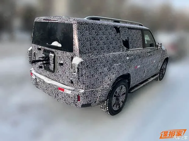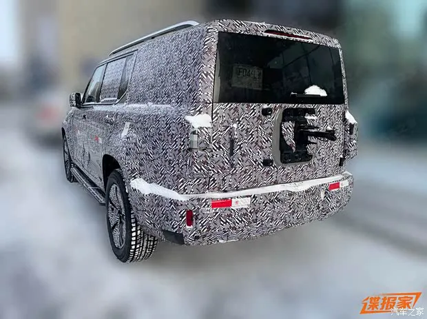 来到侧面,其配备固定式脚踏板以及传统门把手造型,车辆看上去十分魁梧,预计车长将会超过5米,车宽也会在2米左右的水准。车辆尾部依旧十分硬派,尾门中央保留了外挂备胎接口,结合把手判断,将会采用侧开式尾门。