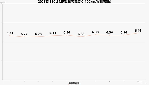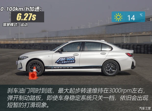 动态性能在加速测试中,“滑成宝马”体现的淋漓尽致,韩泰的轮胎后轮抓地力并不理想,前轮胎尺寸225/45 R18, 后轮胎尺寸255/40 R18。电子稳定程序关两挡后轮打滑现象会非常明显。最终,最好成绩在运动模式、牵引力OFF条件下测得,0-100km/h最好成绩为6.27s。