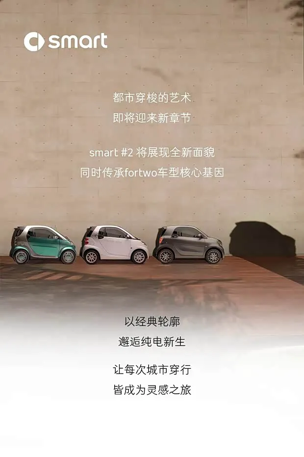 smart精灵#2在初代smart fortwo经典车型上迭代升级,新车定位一款全电动双门双座车型。车辆将保留smart fortwo四轮四角、后轮驱动的布局,但会采用全新的外观及内饰设计,前期将推出双门硬顶版车型,后续还可能推出敞篷版进一步丰富选择空间。同时,预计该车将会采用容量为30kWh左右的电池组。随着smart精灵#6 EHD和smart精灵#2的推出,其将进一步丰富smart品牌产品矩阵,未来将与smart精灵#1、#3、#5和#6共同构成品牌产品新阵容。