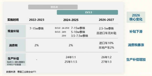 然而,快车道总有终点。 今年2月,政策换挡至EV 3.5:“红包”大幅缩水。现金补贴最高只剩5万泰铢(约合1万元人民币),且仅限本土生产车型;进口车消费税从2%飙回10%。