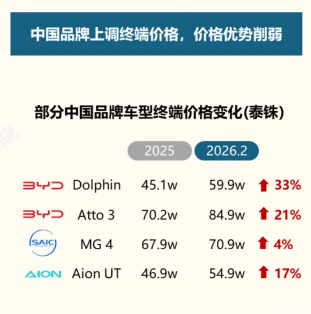 这意味着,许多依靠进口车型打开市场的中国品牌,车价应声上涨,比亚迪海豚最高提价超过3成。