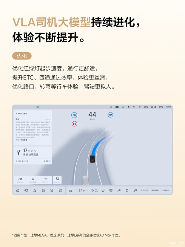 在辅助驾驶层面,VLA司机大模型迎来升级,行车体验更趋拟人化与丝滑化。路口内的轨迹规划稳定性大幅提升,红绿灯起步的速度与通行舒适度同步优化,转弯时的轨迹和速度控制更贴合人类驾驶习惯;高速与城市路况下的巡航舒适性得到改善,ETC 通道通行、匝道行驶的效率也有所提升,让不同路况下的辅助驾驶体验更统一。