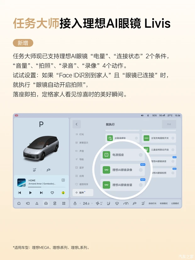 同时,任务大师正式接入理想AI眼镜Livis。用户可将眼镜的连接状态、剩余电量设为智能触发条件,搭配音量调节、拍照、录音、录像等执行动作自定义场景,例如设置眼镜电量低于20%时理想同学自动提醒充电,或通过Face ID识别家人上车时眼镜自动开启录像,记录第一视角出行瞬间。