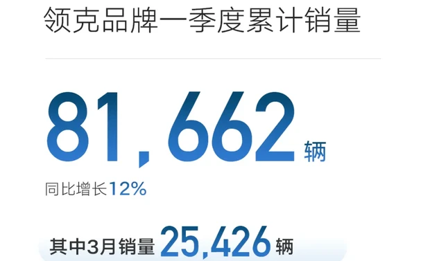 领克品牌一季度累计销量81662辆,同比增长12%;3月单月销量25426辆,保持稳定增长。领克新能源家族一季度累计销量50962 辆,同比增长34%,新能源销量占比高达62%;3月新能源销量 13056 辆,占比51%。