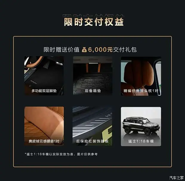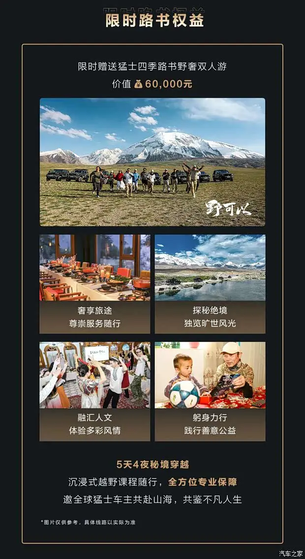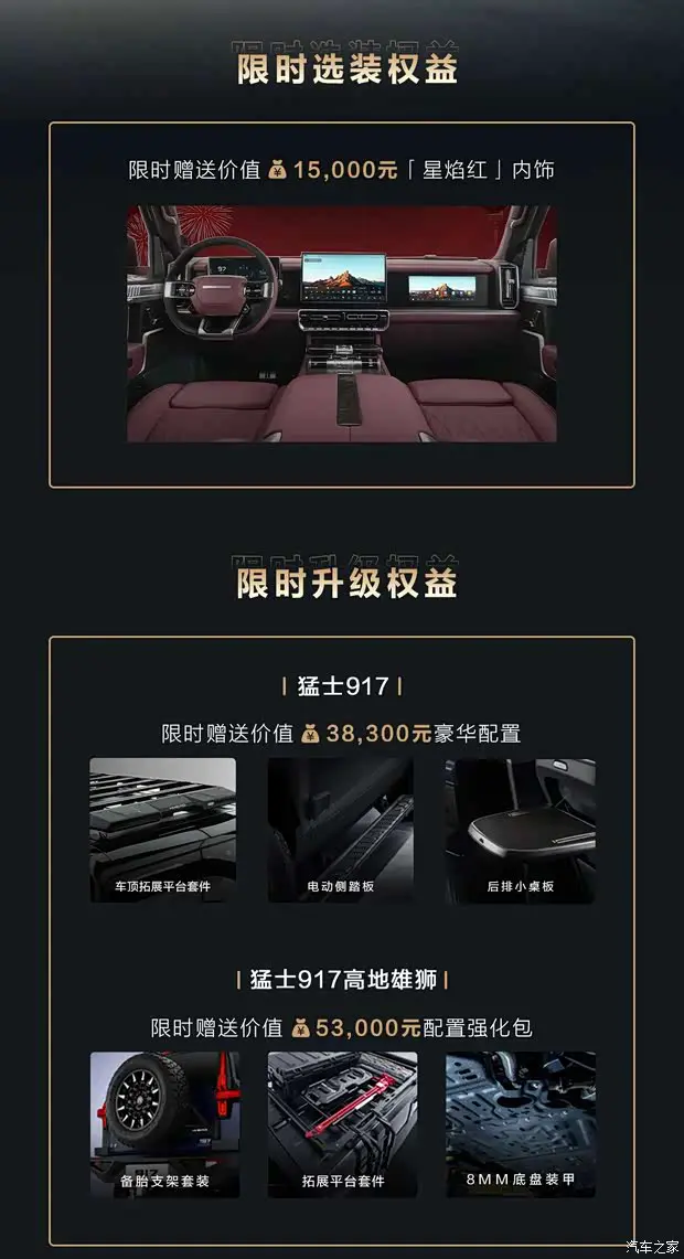 猛士917(参数|询价)可享限时赠送价值1.5万元星焰红内饰,价值3.83万配置(包含车顶拓展平台套件、电动侧踏板、后排小桌板)、价值5.3万(猛士917高地雄狮)配置强化包(包含备胎支架套装、拓展平台套件、8mm底盘装甲)、价值6000元交付礼包(包含后备厢垫、仿麂皮头枕一对、麂皮绒云感腰靠一对、后保险杠装饰踏板、猛士车模、多功能双层脚垫)、价值6万元双人游,以及0首付起/5年贷款/2年免息的金融权益。