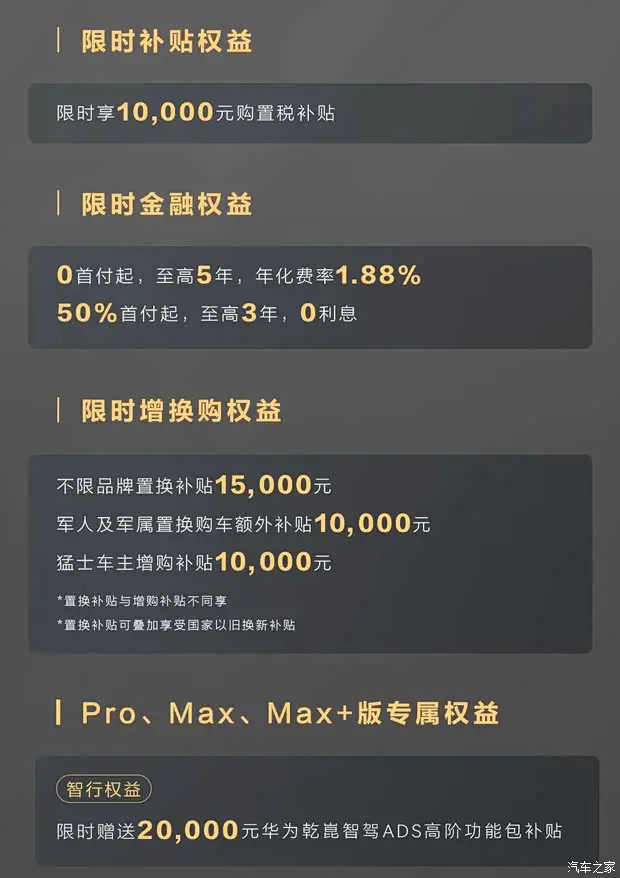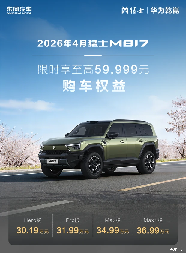猛士M817可享至高59999元购车权益,包括1万元购置税补贴、金融权益(0首付起至高5年低息/50%首付起至高3年0息)、增换购权益(不限品牌置换补贴1.5万元/军人基金军属置换额外补贴1万元、猛士车主增购补贴1万元)、Pro/Max/Max+版可享限时2万元华为乾崑智驾ADS高阶功能包补贴、Hero版享2年车载卫星通讯套餐和10万积分等。(编译/汽车之家 郭辰)