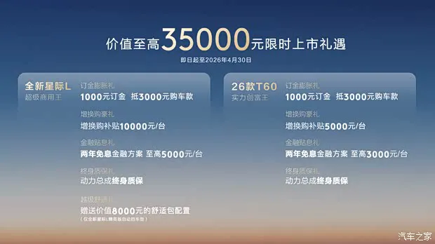 3月30日,我们从上汽大通官方获悉,全新星际(参数|询价)L/2026款星际EV/2026款T60迎来正式上市。全新星际L售价10.88-15.98万元;2026款星际EV售价24.98万元;2026款T60售价7.98-10.18万元。同时,大通官方还推出7天先试后买模式,7天免费用、随便开,深度体验再决定是否购买。