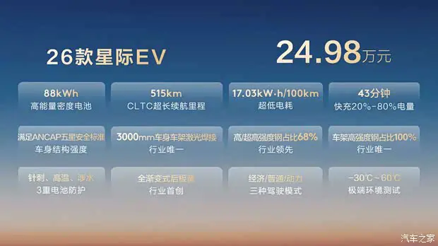 2026款T60同样搭载柴油发动机,最大功率120kW,峰值扭矩410N·m,并配备博格华纳分时四驱系统。2026款星际EV采用纯电动力系统,配备88kWh电池组,快充20%—80%仅需43分钟,同时支持6.6千瓦外放电功能。