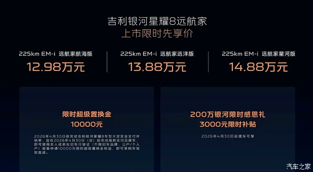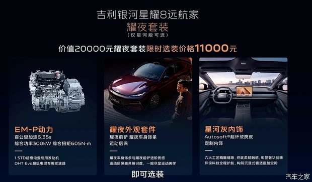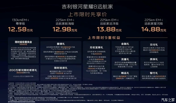 动力方面,新车搭载1.5L发动机与电机的组合,最大功率分别为82kW和175kW,匹配单挡DHT变速箱;另外新车还会搭载新一代神盾金砖电池,纯电续航提升至225km,综合续航提升至1725km;并全系标配160km/h全场景爆胎稳定控制系统。编辑点评:吉利银河星耀8自2025年5月推出以来,上市8个月累计销量已经突破8万辆,不仅快速在新能源轿车市场站稳脚跟,更是凭借出众的性价比优势,在销量方面超越比亚迪汉,曾创下连续12周蝉联细分市场销量冠军。此次新增远航版车型,其整体产品力得到全面提升,将它的战力六维图进一步扩大,那么它后续市场表现如何,让我们拭目以待。