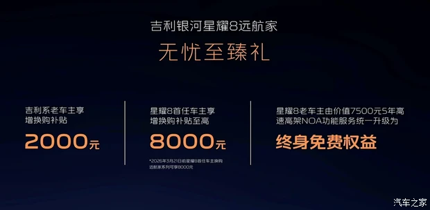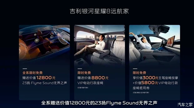 购车可享9重购车权益,包括10000元超级置换金、3000元限时补贴、限时免费享价值12800元23扬Flyme Sound无界之声、限时免费享价值8800元VIP电动行政座椅(尊享版/星河版可享)、限时免费享价值3000元主驾座椅按摩+价值5800元VIP电动行政座椅抵用券(航海版/远洋版可享)、限时11000元享价值20000元耀夜套装选装(星河版可享)、限时2000元享价值5000元丹霞矿高定车色选装(航海版/远洋版/星河版可享)以及7年低息(首付2.58万起,月供低至1336元起)、至高10万24期0息或5年贷2年0息等等。