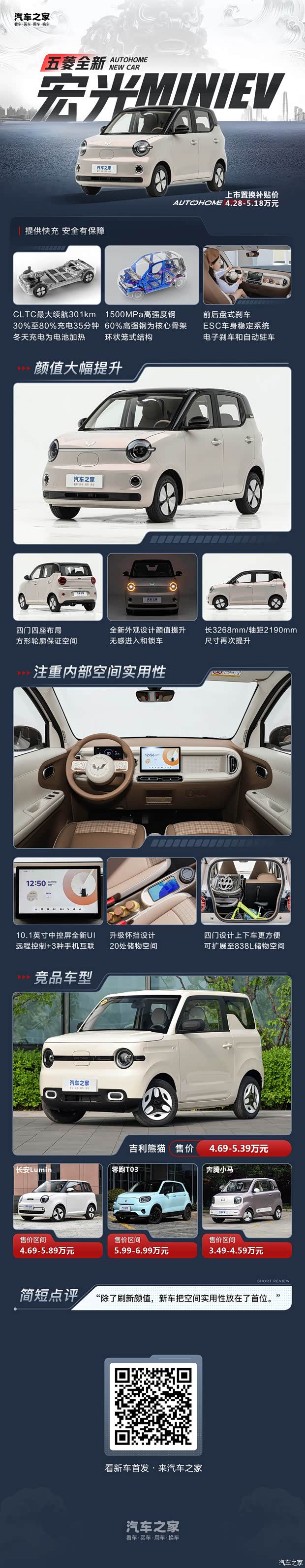 长安Lumin同时,全新宏光MINIEV在颜值上也进一步提升,而更重要的是它采用了四门的开启方式,相比传统微型车后排乘客上下车更为方便,空间实用性大大提升。● 编辑点评:从去年宏光MINIEV推出四门版车型之后,增强了微型车的实用性,也巩固了宏光MINIEV的市场地位,全新宏光MINIEV延续了四门的设计,同时,进一步提升了储物能力,把空间实用性放在了首位。在安全层面、车机系统层面也有所升级,综合产品实力明显提升。更精致可爱的外观与内饰设计,也将成为吸引消费者的核心要素。