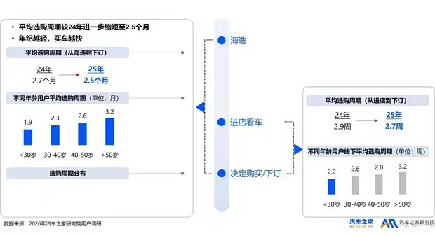 用户选购周期缩短,越年轻的用户决策越快用户从海选到下订的平均选购周期较24年进一步缩短至2.5个月,其中,越年轻的用户,决策速度越快。他们不再愿意花几个月的时间反复比价,而是追求高效的消费体验。