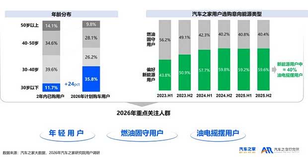 前言在汽车之家研究院2025年发布的《购车用户趋势洞察》报告中曾指出,“两新”政策的实施催生用户的“返古”特征。进入2026年,尽管“两新”政策仍在延续,但其支持力度与政策方向均出现调整,叠加新能源汽车购置税优惠政策的退坡,购车人群的消费逻辑与行为特征正呈现出新的演变趋势。与此同时,AI的加速普及以及车圈明星代言的回归,也在影响用户的购车决策路径,重塑汽车市场的营销生态。为深入理解上述变化,汽车之家研究院对近6000位已购车及计划购车用户的定量调研,结合汽车之家大数据,全面解析购车用户的行为偏好与选购逻辑,勾勒出2026年乘用车市场的三大用户新变化:人群新变化、选购新变化、营销新变化。01 人群新变化:三类人群主导2026年车市变化“两新”政策透支置换需求后,首购用户占比回升,年轻用户有望成为2026车市新主流。此外,从汽车之家用户选购意向来看,新能源用户占比达到60%后增长进入平台期,短期内燃油固守用户将拥有稳定的基盘量。同时,在偏好新能源的用户中有约40%的用户仍在油电选择中摇摆,新能源增势将依赖油电摇摆用户的选择。因此我们建议在26年车市中,应重点关注年轻用户、燃油固守用户及油电摇摆用户三类核心人群。