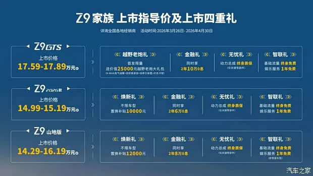 动力方面,柴油版车型搭载2.3T涡轮增压发动机,最大功率166马力(122千瓦),最大扭矩420牛·米,与之匹配6MT和8AT变速箱;汽油版车型搭载2.0T涡轮增压发动机,最大功率228马力(168千瓦),最大扭矩360牛·米,同样匹配6MT和8AT变速箱。值得一提的是,中高配车型将采用前双叉臂式独立悬架和后五连杆式独立悬架。新车依旧提供四驱系统。● Z9家族2026款Z9家族基本延续现款车型的设计,主要是在价格、配置层面上的调整,同时,包含2026款Z9、Z9山地版和Z9 GTS三个版本。